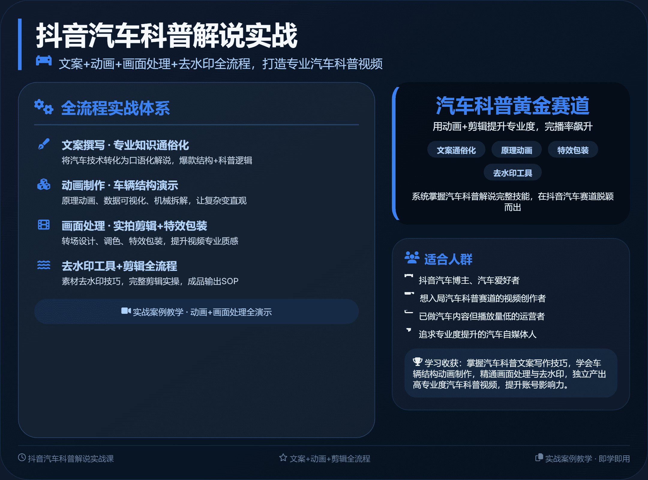 【21466】抖音汽车科普解说实战:文案+动画+画面处理+去水印全流程,打造专业汽车科普视频