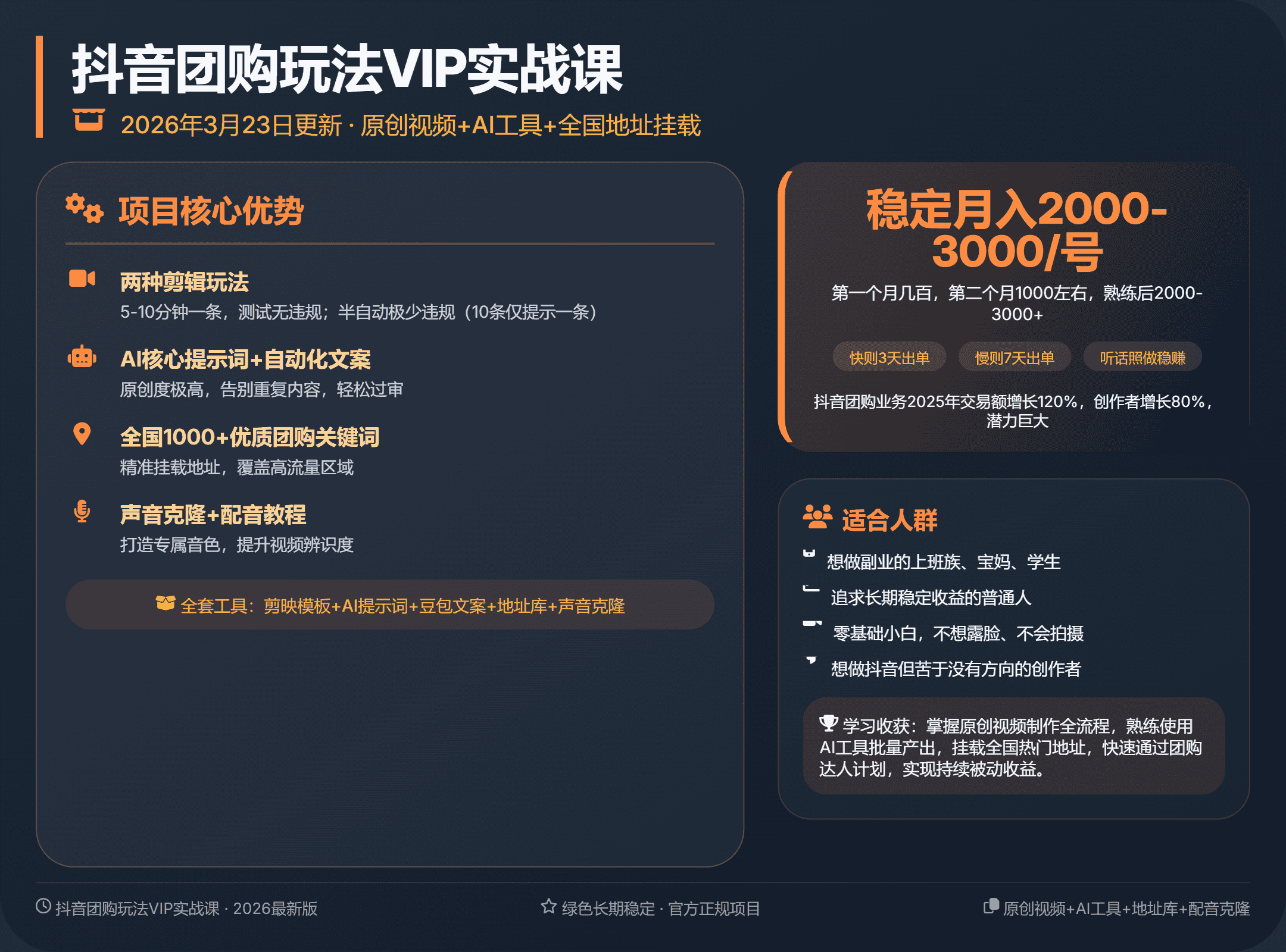 【21469】抖音团购玩法VIP实战课-2026年3月23日更新:原创视频制作+全国地址挂载+AI工具+提示词+素材,全流程