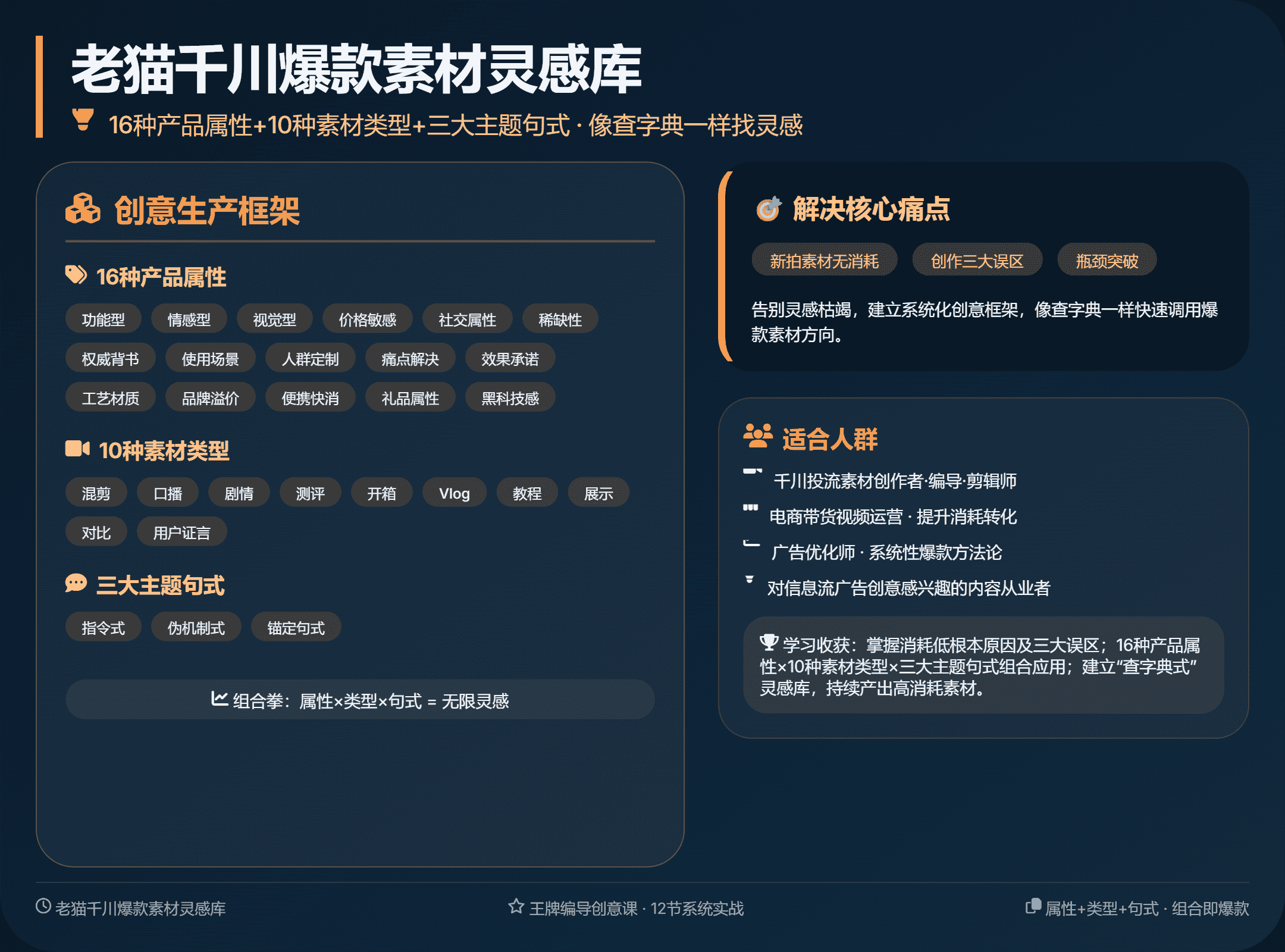 【21475】老猫千川爆款素材灵感库:16种产品属性+10种素材类型+三大主题句式,像查字典一样找灵感