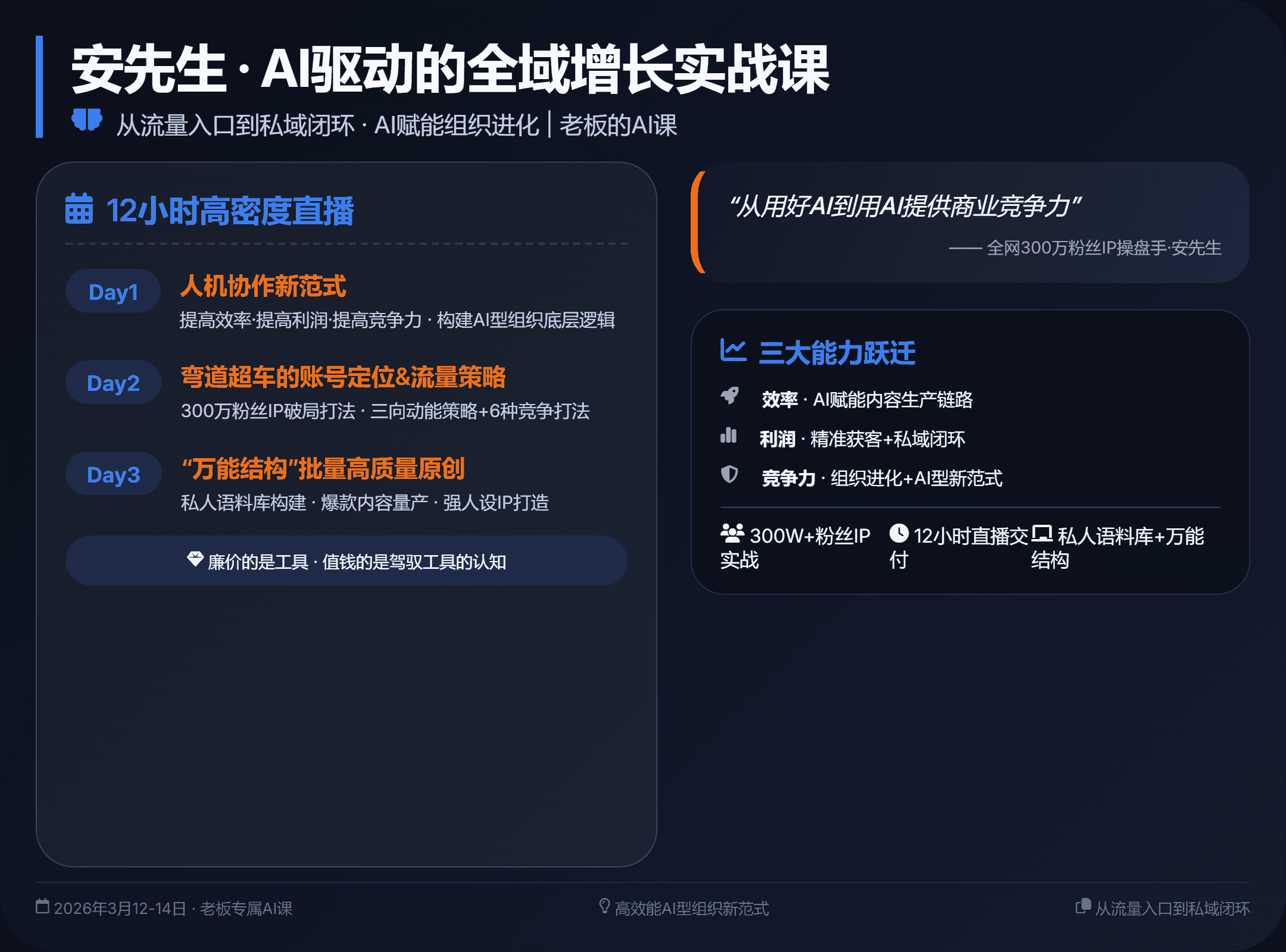 【21489】安先生AI驱动的全域增长实战课,老板的AI课,从流量入口到私域闭环AI赋能组织进化(26年3月12-14日)
