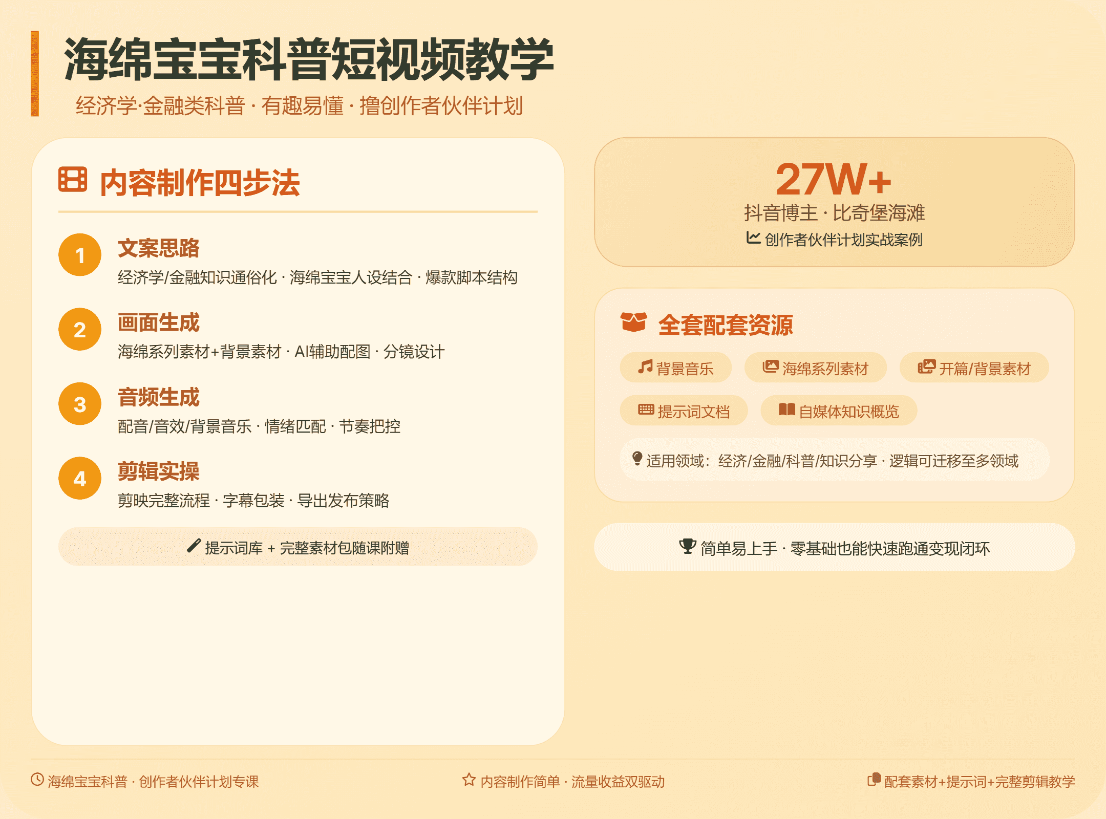 【21490】抖音27W粉丝博主的海绵宝宝科普短视频教学,内容制作简单,撸创作者伙伴计划