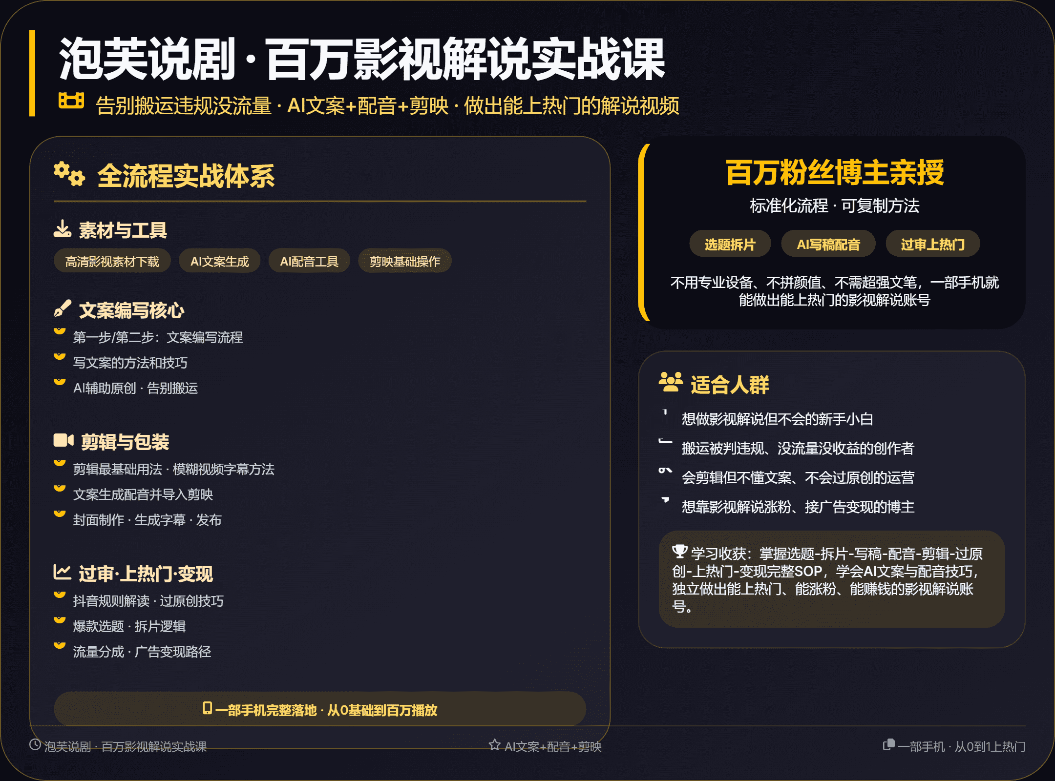 【21512】泡芙说剧百万影视解说实战课:告别搬运违规没流量,AI文案+配音+剪映,做出能上热门的解说视频