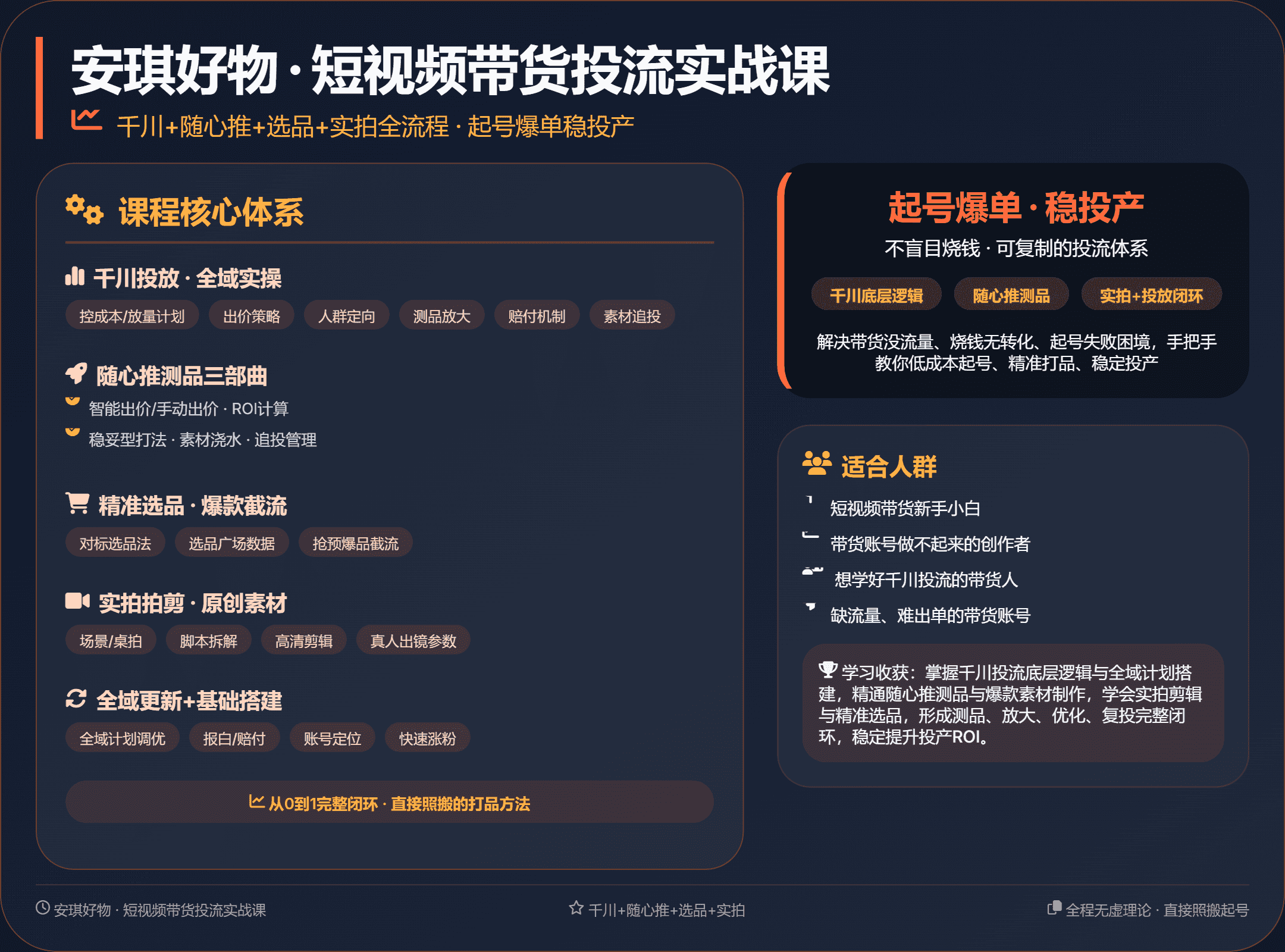 本课程为市面售价599元的短视频带货投流实战课,全程无虚理论,聚焦千川起号到爆款起量全流程,覆盖实拍拍剪、千川投放、随心推玩法、精准选品、抖音基础搭建、全域投放更新等模块,从账号定位、素材制作、计划搭建、出价策略、人群定向,到测品、放大、优化、复投形成完整闭环,提供可直接照搬的好物投流与打品实操方法,帮带货者跳出无流量、烧钱无转化、起号失败的困境。