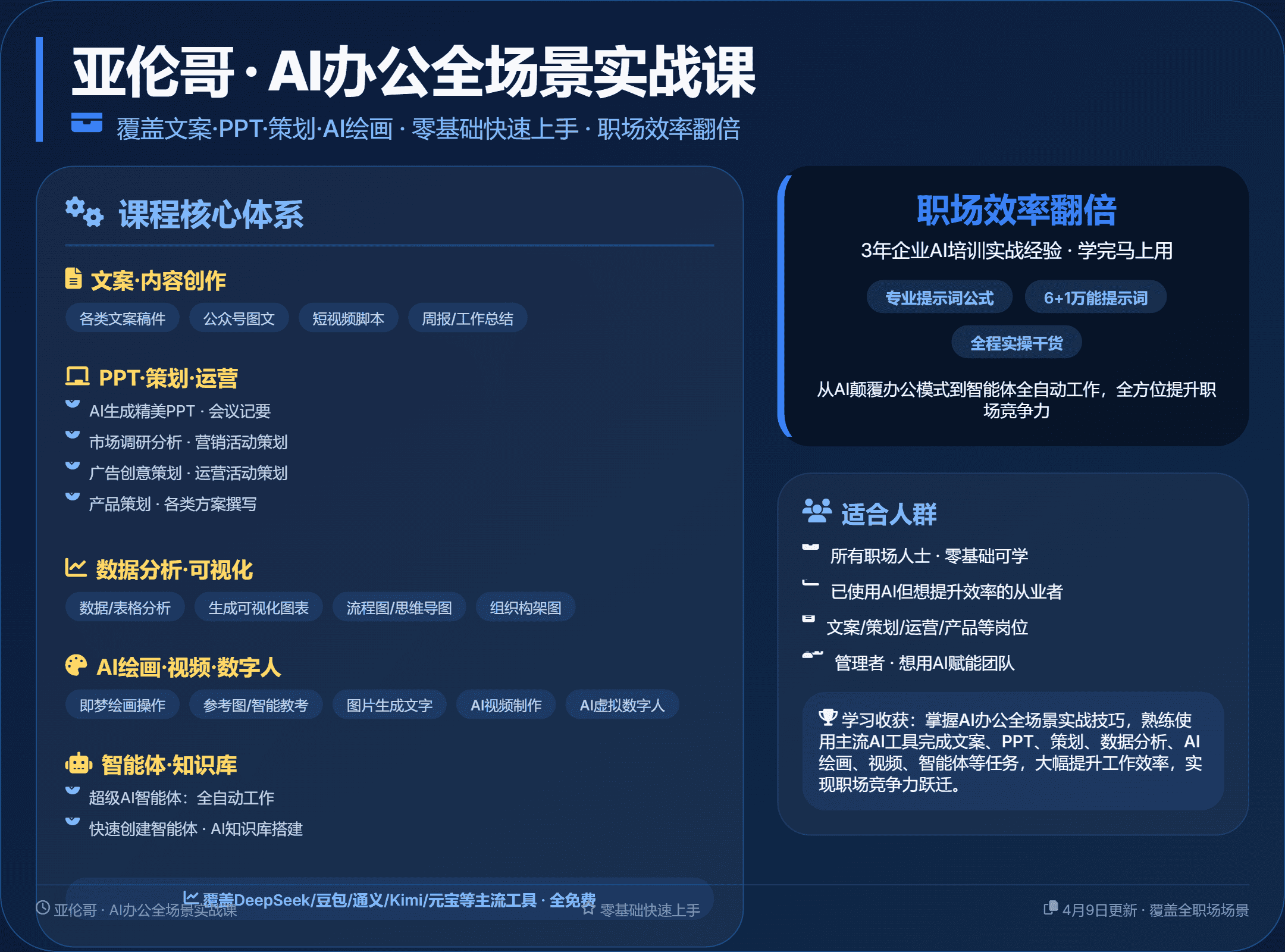 【21526】亚伦哥AI 办公全场景实战课:覆盖文案、PPT、策划、AI 绘画,零基础快速上手,职场效率翻倍【4月9日更新】