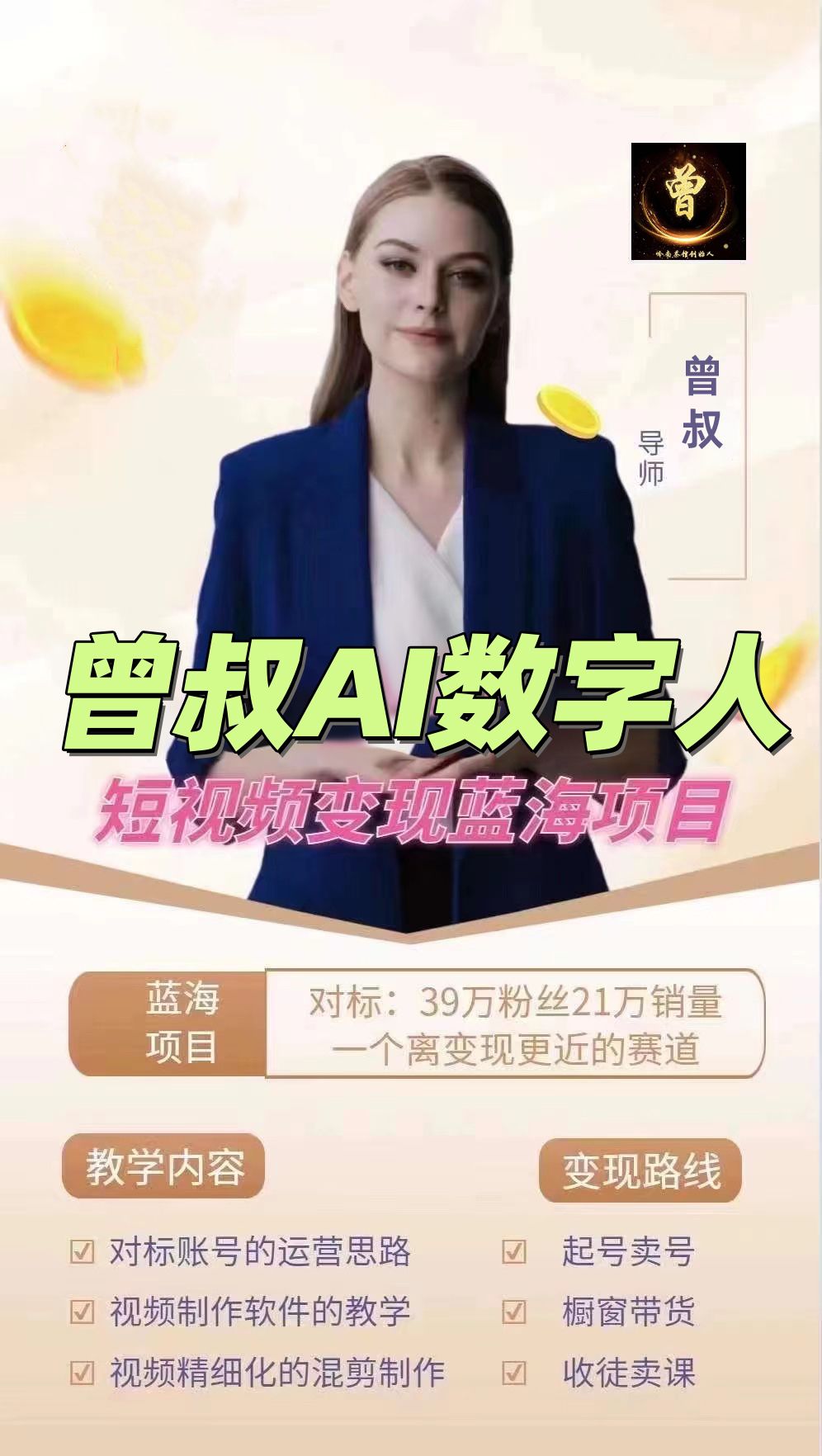 【8783】曾叔AI数字人 短视频蓝海变现项目 带货流量主收徒皆可