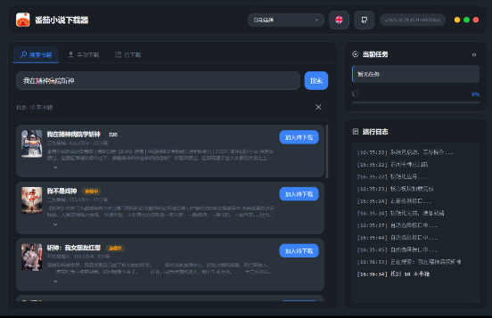 一个现代化、高效的番茄小说下载器,使用 Python 构建,配备简洁、响应式的网页界面。功能特性包括图书搜索(轻松按标题或作者搜索图书)、批量下载(一次下载多本图书)、格式支持(导出为 TXT 或 EPUB 格式)、封面图片(自动获取并在 EPUB 文件中嵌入图书封面)以及章节选择(下载完整图书、特定范围或手动选择的章节)。